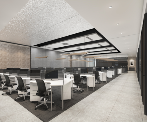 现代化且设计简洁明亮的开放办公空间。办公桌为白色,办公椅为黑色,排列整齐。天花板有黑色线条装饰,墙面饰以木质装饰板,增添温馨感。整体布局合理,既适合团队协作,又能保证高效工作。