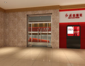 展示了红旗出版社的入口空间设计。玻璃大门上贴有醒目的红色"红旗出版社"标识,右侧墙面安装着现代感十足的电子显示屏,红白相间的背景墙设计简洁大气,整体空间既体现了传统出版机构的庄重感,又融入了数字化时代的科技元素,营造出专业而富有活力的文化机构形象。