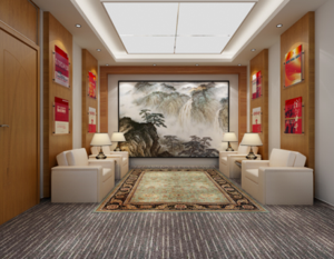 这是一间装饰典雅的豪华会客室,配备两张白色沙发,中间铺设精美地毯。墙上挂着山水画,两侧点缀红色装饰画,天花板装有嵌入式照明,营造出温馨且专业的氛围,彰显高端品质。