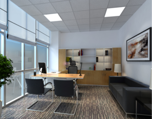 展现了一间采光优越的现代办公空间。宽敞的落地窗引入充足自然光,办公区域配置了功能齐全的工作台与电脑设备,背景墙的书架陈列着整齐的书籍资料。休息区摆放着黑色皮质沙发与暖光台灯,墙面装饰画为空间增添艺术气息,整体呈现简约而不失格调的专业办公环境。