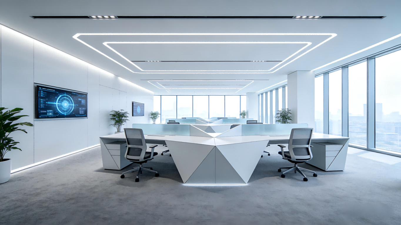 2. 灯光与色彩:办公区采用4000K-5000K无频闪LED灯,保护员工视力;会议、洽谈区配备可调光灯,适配接待、研讨等不同场景;色彩以企业VI色为主,搭配白、灰、浅木色等中性色,增强空间质感,传递企业气质。