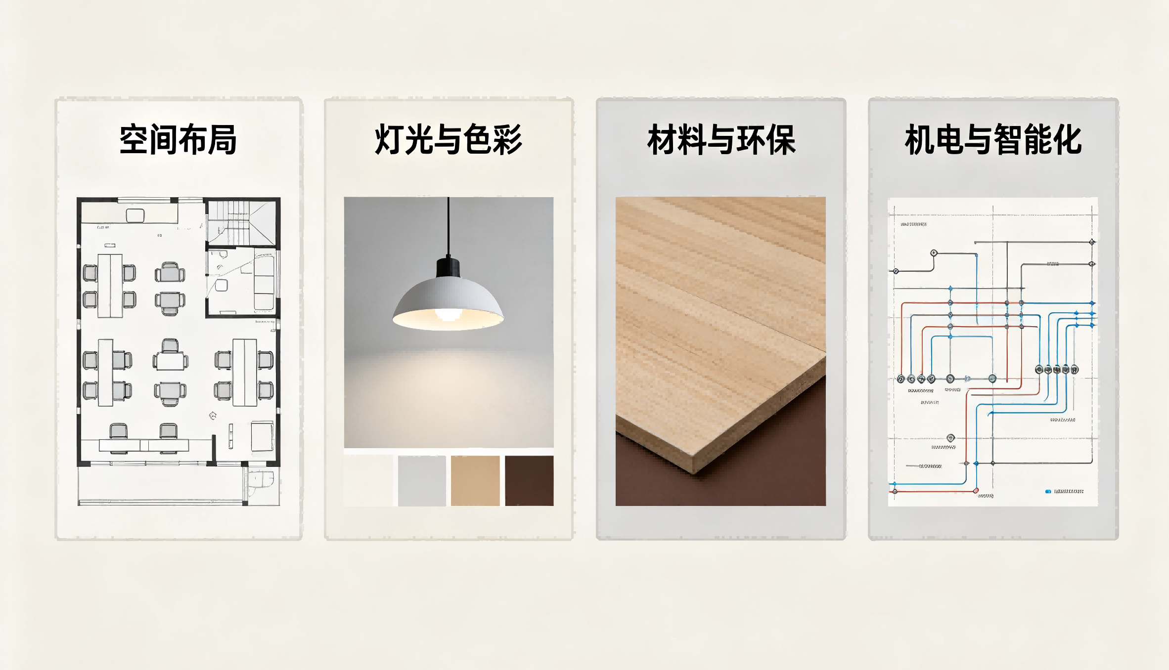 4. 机电与智能化:水电布管横平竖直,强电弱电间距≥30cm,水管打压测试24小时,电路做漏电保护;全覆盖WiFi(AP点位无死角),安装门禁、监控系统,预留服务器机房专线接口,适配现代办公需求。
