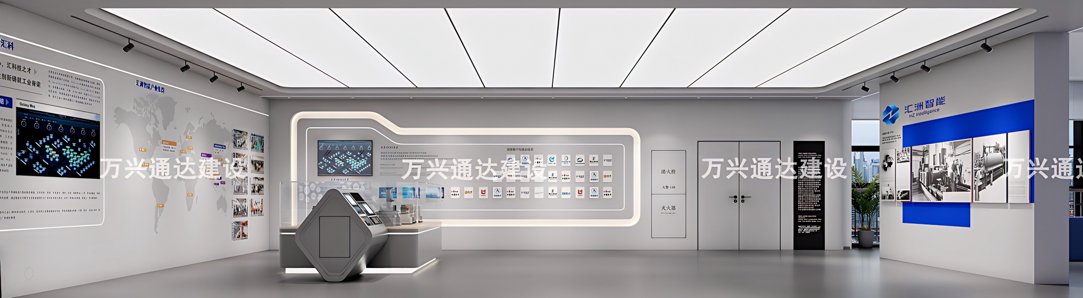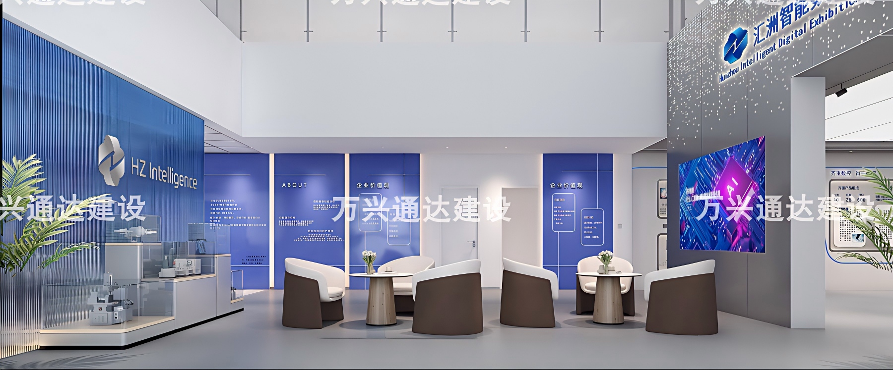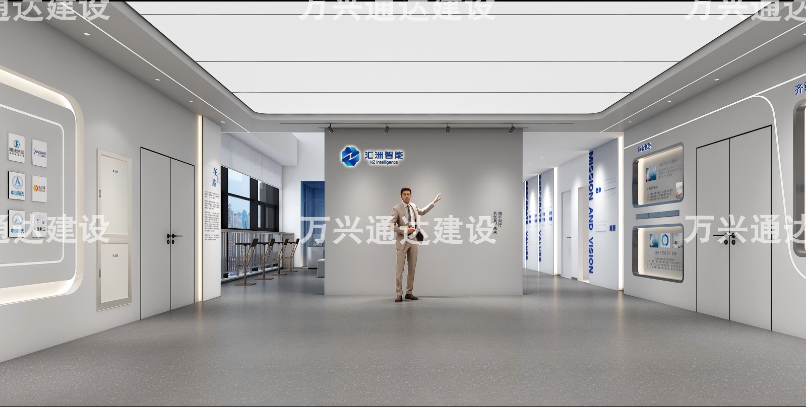 设计理念:智能数字展厅以科技感、品牌化、人性化为核心设计理念,采用白灰主色调搭配科技蓝点缀,以极简现代的空间语言、层次化智能光影与通透开阔的布局,打造契合智能制造属性的未来感氛围;以清晰的参观动线串联品牌形象、发展历程、产业实力与使命愿景,实现企业价值的沉浸式传递;同时融入休闲洽谈区、自然采光与模块化展示结构,兼顾商务接待、内容迭代与长期运维需求,打造集品牌展示、文化传播、商务洽谈于一体的现代化数字展厅。