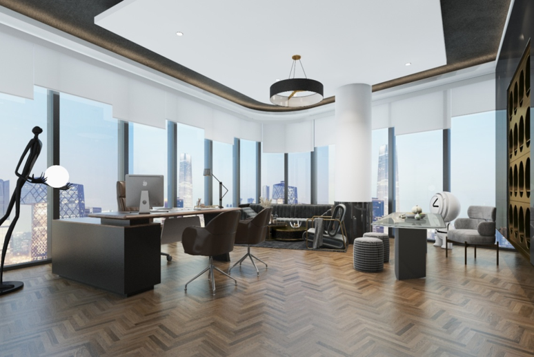 拥有大窗户可览城市美景。室内设计简洁,配备舒适沙发与扶手椅,办公桌电脑齐全,书架摆满书籍。氛围专业且温馨,既适合工作也适宜休闲。