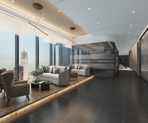 迎合公司"护航每个家庭"的品牌主张,使用家具式的装修风格,把客户放在首要。为了接待时拥有更好的状态。也拥有落地窗,可欣赏城市美景。室内装饰简洁大方,配有舒适的沙发、椅子及精致茶几。天花板吊灯设计独特,营造出温馨且时尚的氛围。