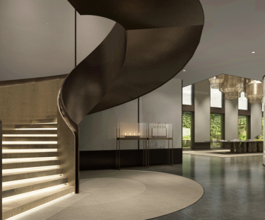这是一间充满艺术气息的讨论角,原木色书柜与白色墙面相得益彰,营造出温馨氛围。落地窗将自然光温柔洒入,绿植点缀其间更添生机。为阅读和工作提供理想环境。整个空间既实用又美观,散发着宁静优雅的气质。螺旋形楼梯优雅盘旋,旁有嵌入式灯光温柔照耀。背景中,玻璃展示柜熠熠生辉,大窗户引入满室绿意,窗外风景如画,让整个空间显得宽敞而明亮,营造出一种温馨而高雅的氛围。