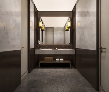 这张照片展现了一个现代简约风格的室内休闲空间,原木色地板与绿植相映成趣,落地窗引入自然光线。米色布艺沙发搭配圆形茶几,,整体营造出宁静舒适的氛围。大理石墙面地板高档大气,镜子旁壁灯照亮空间。洗手台下储物整齐,毛巾洗漱用品一应俱全,设计简洁优雅,尽显品味。